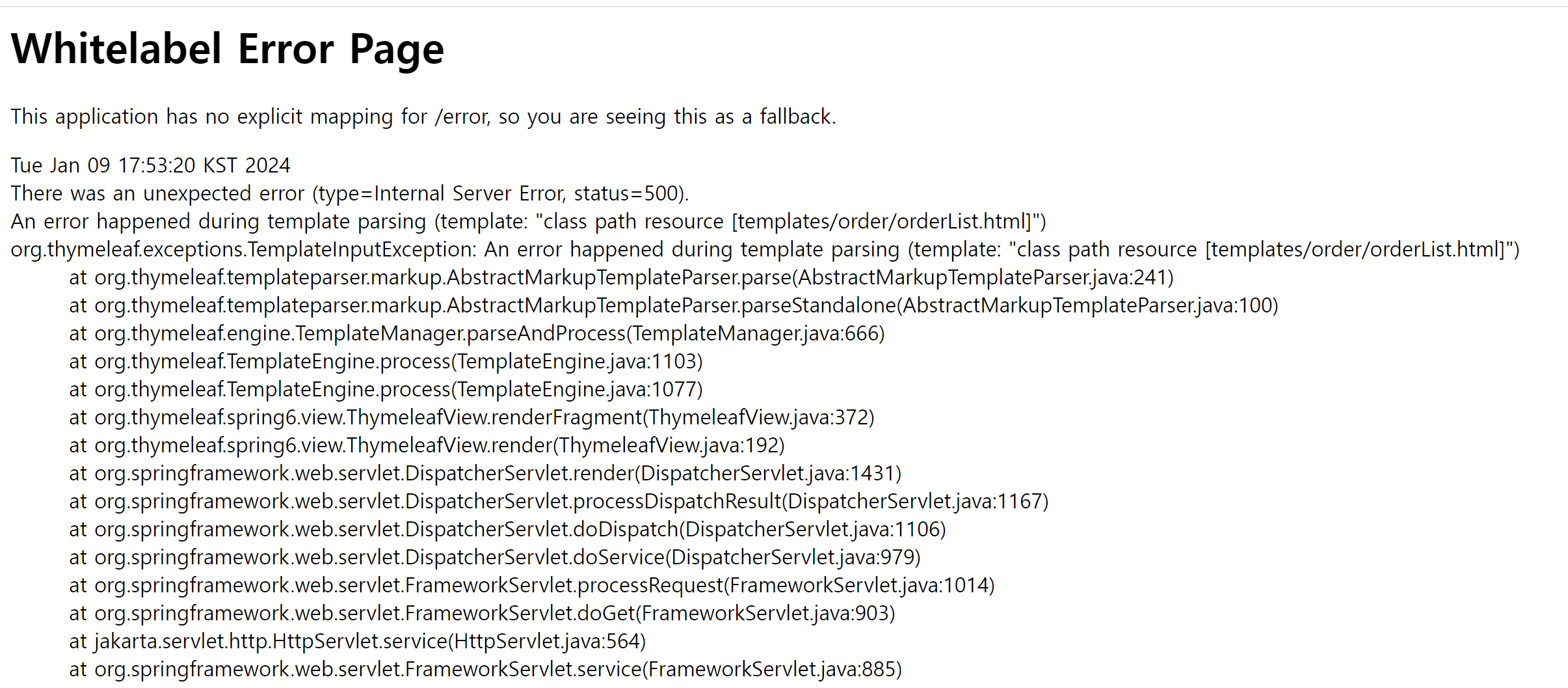 주문를 할 경우 아래와 같은 오류로 화면이 랜딩되지 않는 오류 발생