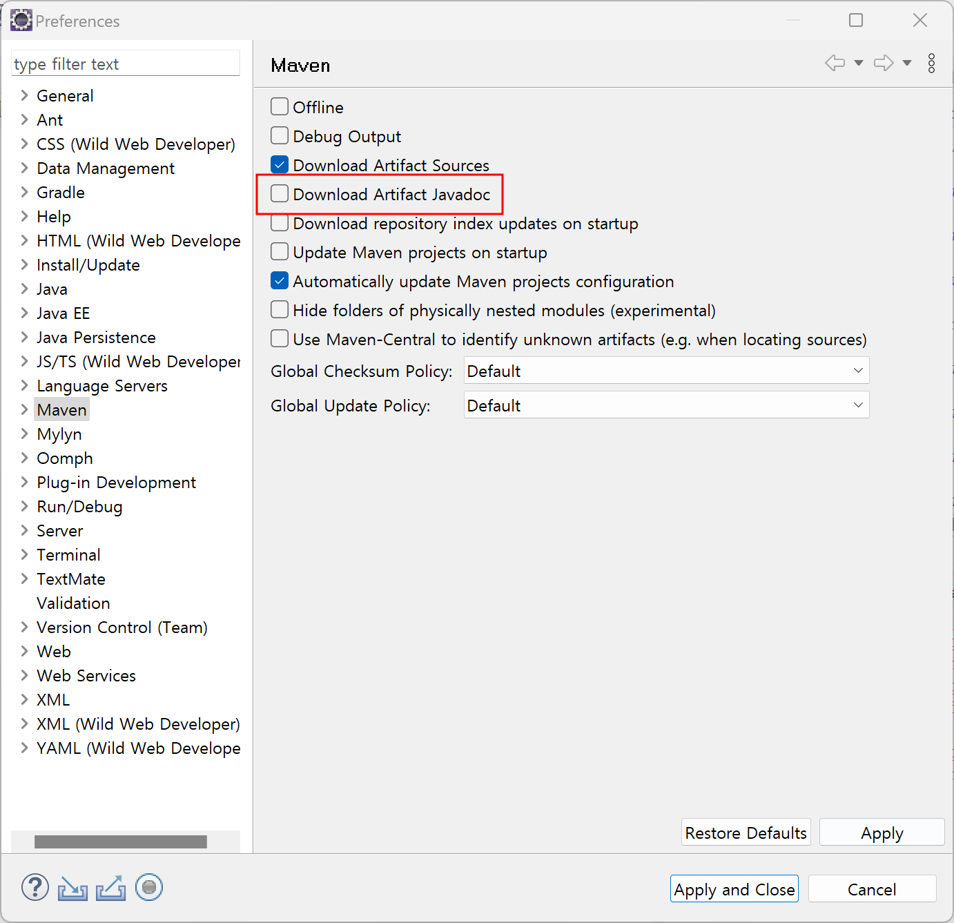 Preferences -> Maven -> Download Artifact JavaDoc 체크를 해주었다.